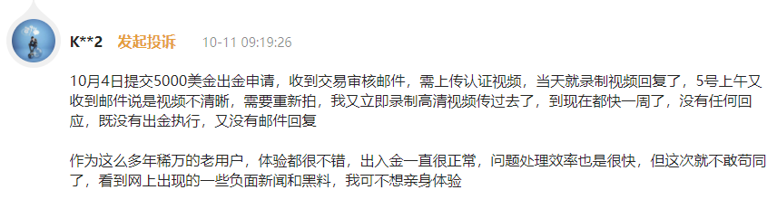 “一个月以前出金时,他们要求拍个人护照自拍视频;发过去之后他们说要一个月审核,结果他们把我账号冻结了并且也不回复邮件。”