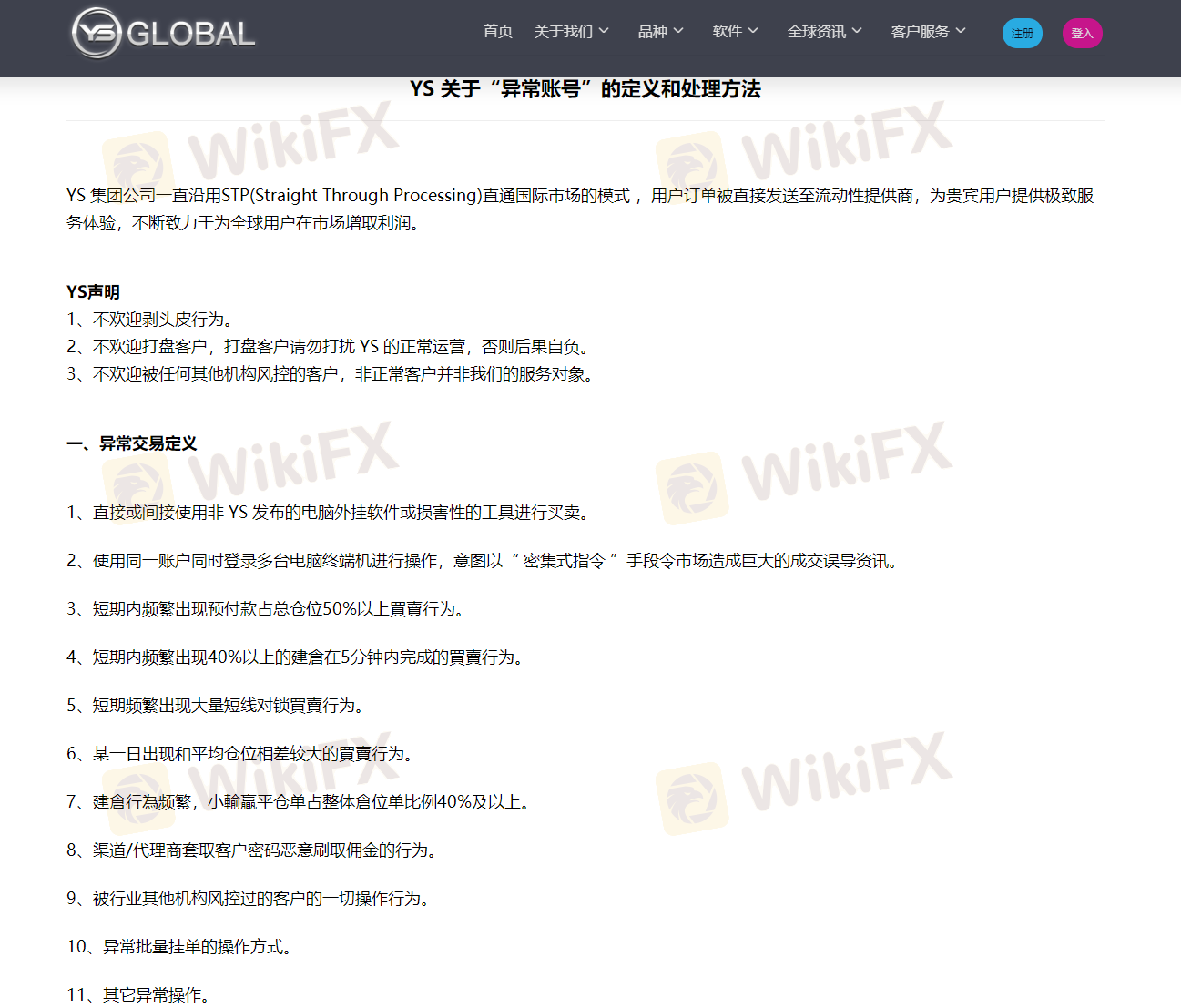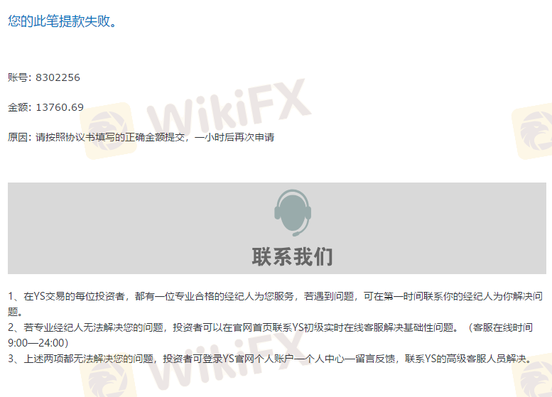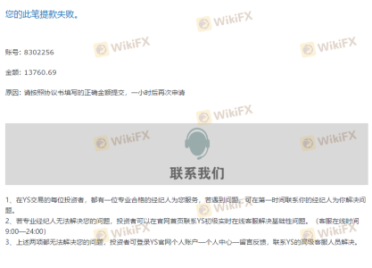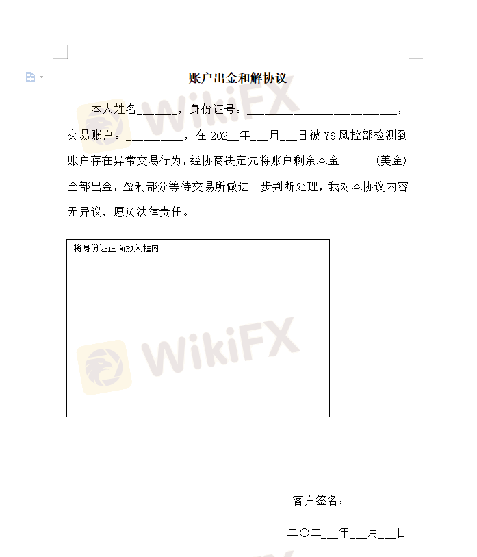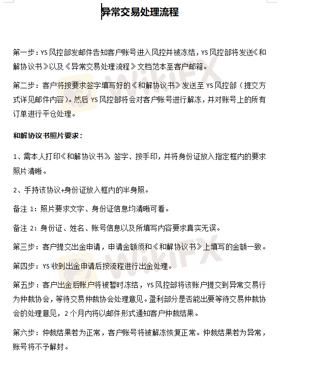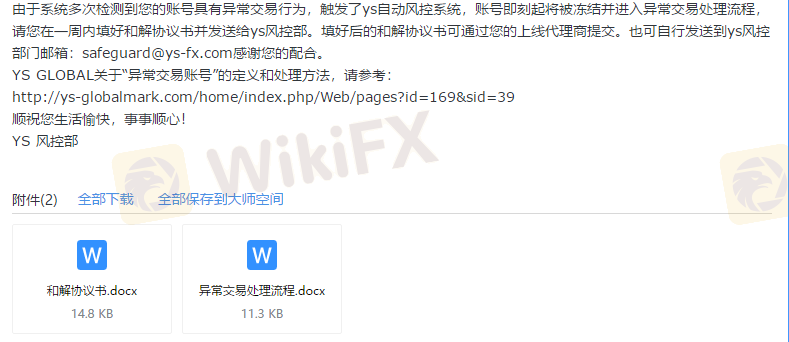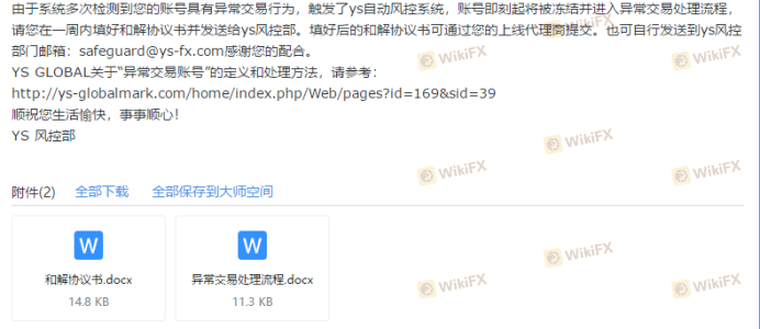 我于3月20日先后存款总计6000美金在YS Global交易。于5月4日合计赚取7760美金,并提交全部出金遭拒。同时收到YS Global判定我账户为异常账户,包含“《和解协议书》《异常交易处理流程》”附件的邮件。邮件中要求我签署《和解协议书》,盈利部分要仲裁我交易两个月。这些我都理解,但是注销我账号是什么意思,我属实是看不懂。并且退还我本金之后,给风控部和法务部发邮件再没收到回复。我登录账户管理后台时,已显示“账号不存在”。让我等两个月,是等我遗忘“历史”么?纯属欺诈。